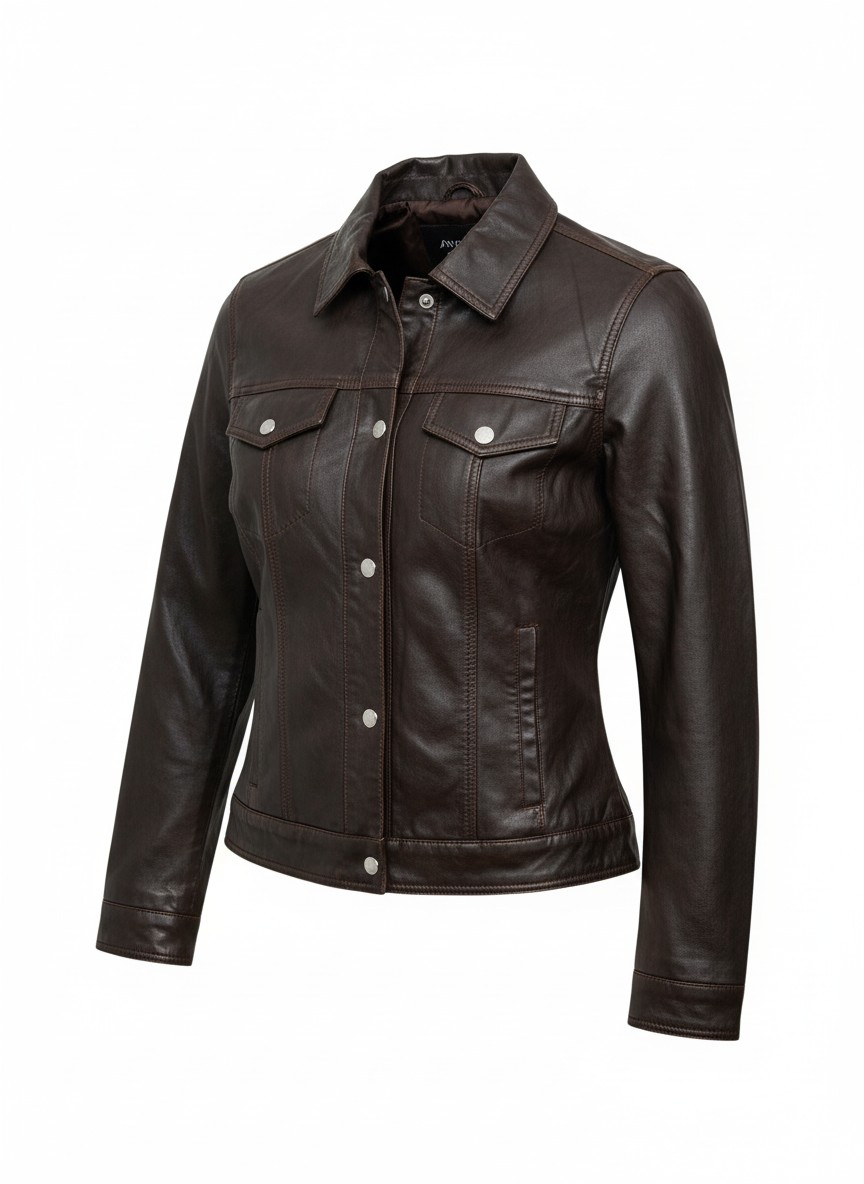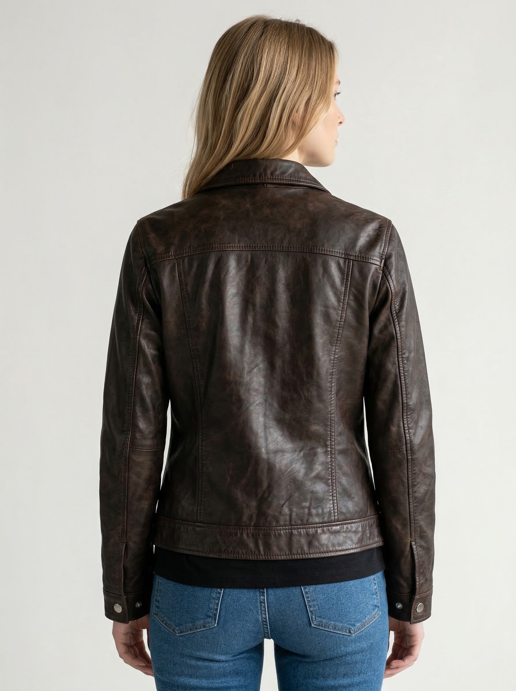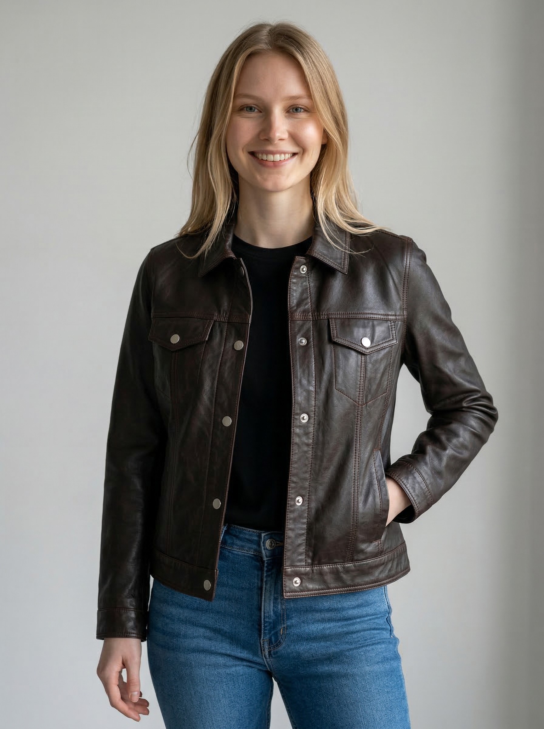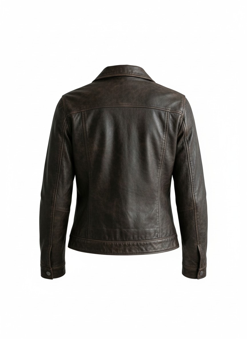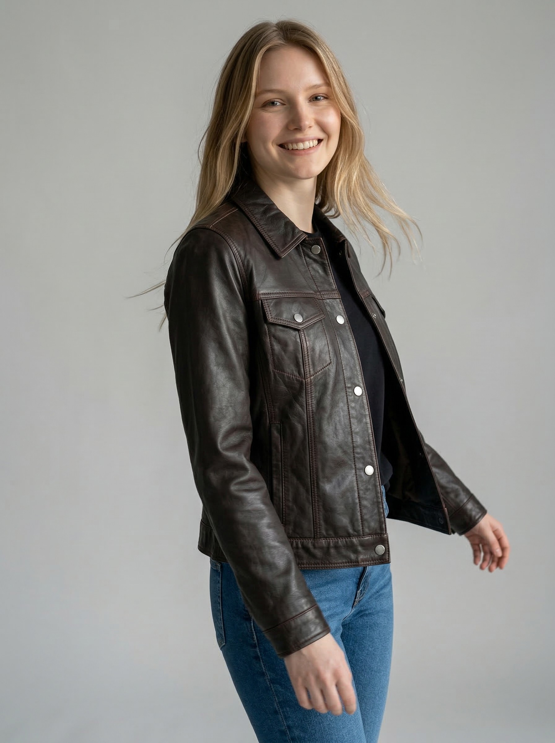 Crafted from soft, top grain distressed brown lamb leather, this modern interpretation of the classic trucker jacket delivers exceptional comfort, durability, and timeless style with a flattering women’s fit. Designed to make a lasting impression, it is an ideal premium promotional piece for elevated corporate gifting and branded apparel programs.
